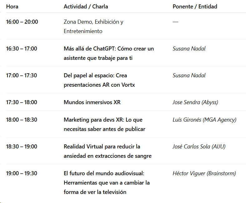En este evento, las empresas mostrarán sus proyectos más innovadores y los avances que están marcando tendencia en el mundo XR. Además, los centros educativos y de investigación presentarán su oferta formativa y sus iniciativas, creando un espacio ideal para conectar el talento con las oportunidades del sector. ¡Una gran ocasión para descubrir, aprender y hacer contactos!